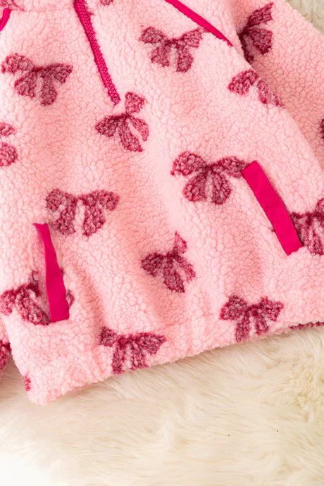 Stay warm and stylish with this Girls Fuchsia Coquette Bow Sherpa Pullover. Made from 100% polyester, it offers soft, plush comfort and durable warmth. The vibrant fuchsia color combined with a charming bow detail makes it perfect for cooler days, providing both cozy insulation and a playful look. Ideal for layering, this pullover balances fashion and function effortlessly.