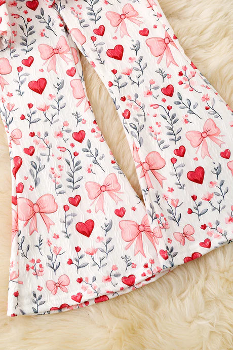 This girls' two-piece set, featuring a charming heart and bow print, is crafted from a comfortable blend of 95% polyester and 5% spandex. The fabric combination offers durability with a slight stretch for ease of movement, making it ideal for active wear while maintaining a soft feel against the skin. Perfect for casual outings or playdates, this set combines style and comfort effortlessly.
