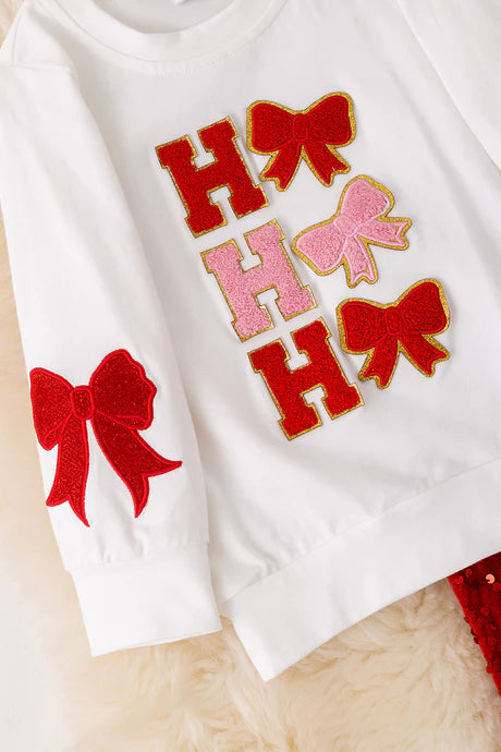 This stylish "Ho Ho Ho" Coquette sweatshirt combines comfort and festive flair with a soft 97% cotton and 3% spandex blend for a flexible fit. Paired with red sequin bell bottoms, the bottoms are lined for added comfort and durability, crafted from 95% polyester and 5% spandex to ensure stretch and ease of movement. Perfect for holiday occasions, this set balances cozy warmth with eye-catching design.
